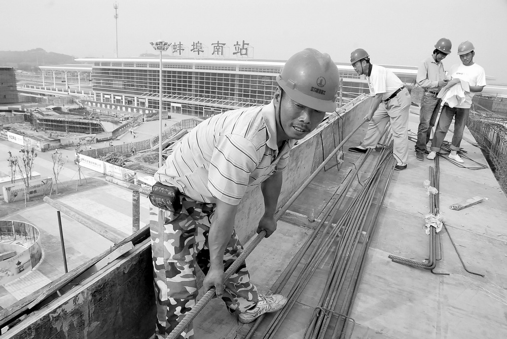 7月13日,施工人員在進行蚌埠南站配套服務樓屋頂鋼筋綁扎施工。據(jù)了解,高鐵蚌埠南站配套服務樓主體施工進入尾聲,16日將開始進行混凝土澆灌封頂施工。